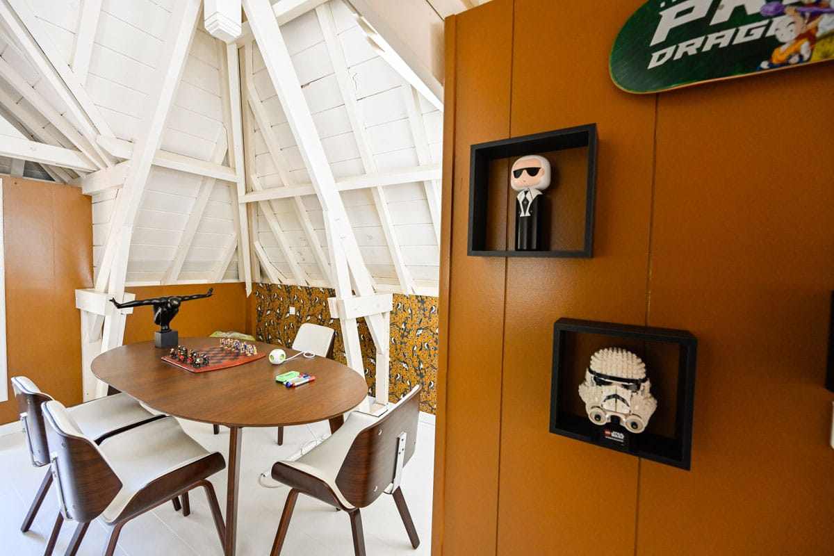 Une fois la porte d’entrée de la case créole franchie, pénétrez dans un incroyable univers aux couleurs chatoyantes. Un projet qui remonte au début 2021. L’engouement pour la décoration des deux associés, experts-comptables, se confirme à mesure que vous parcourez la maison. On retrouve ici un esprit club avec une forte singularité pour chacune des pièces où les références cinématographes sont très présentes. Des années 50 aux productions Marvel d’aujourd’hui.